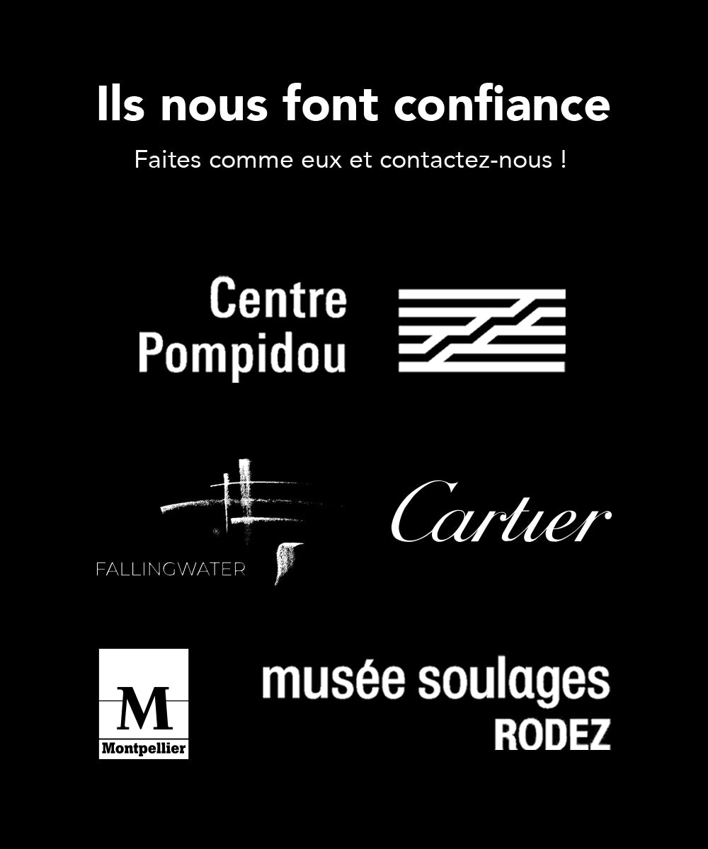 De nombreuses marques et musées nous confient leurs besoins, leurs idées, leurs problématique et nous créons pour elles le produit le plus juste possible. Parmi elles : Le Centre Pompidou, Cartier, Le Musée Soulages, La Mairie de Montpellier, Le Royal Monceau, le Peninsula HK, Material Bank, Bauhaus Dessau School, Nortia, Ulysses, Best Western…