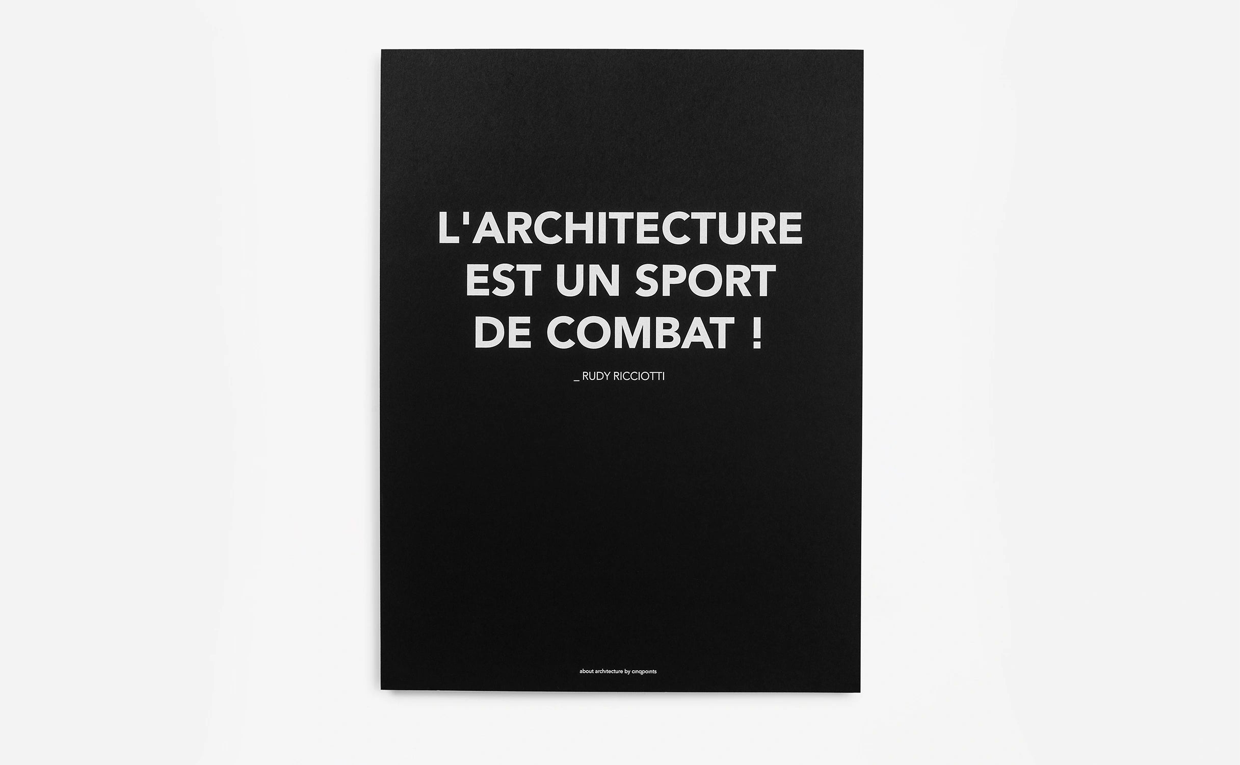 'L'architecture est un sport de combat' est une affiche imprimée en sérigraphie blanche, sur un papier de haute qualité noir, reprenant la célèbre phrase de l'architecte français Rudy Ricciotti.